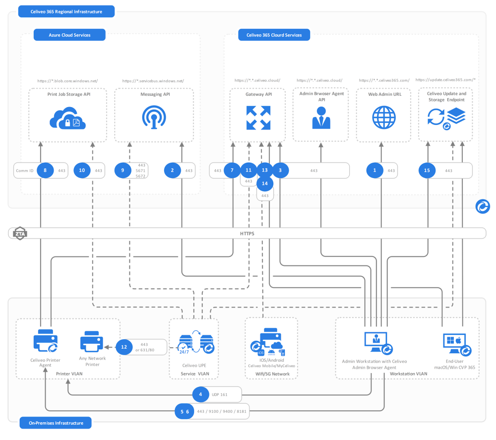 This section details information about all Celiveo 365 components and protocols/ports used to access services and endpoints for day-to-day and one-time operations.